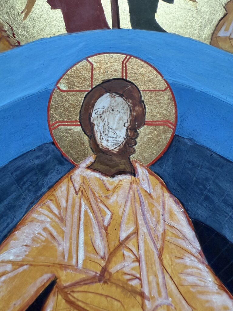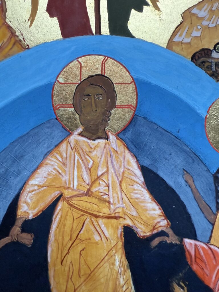 Da es schlussendlich noch SEINE Ikone sein sollte, habe ich entschlossen, mich im Wesentlichen auf das Inkarnat, besonders die Gesichter und den Auferstandenen zu konzentrieren. Ansonsten wurden nur notwendige Ergänzungen vorgenommen: die Gloriole, die Engel mit ihren Heiligenscheinen und die Beschriftung.